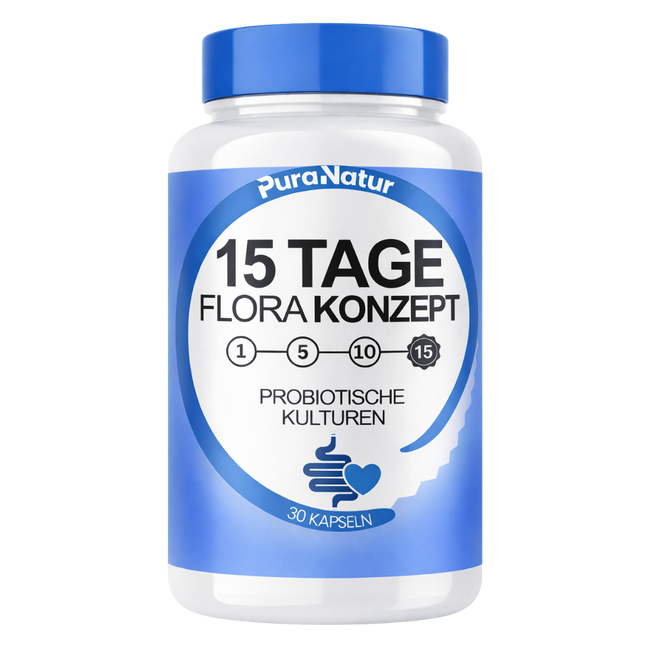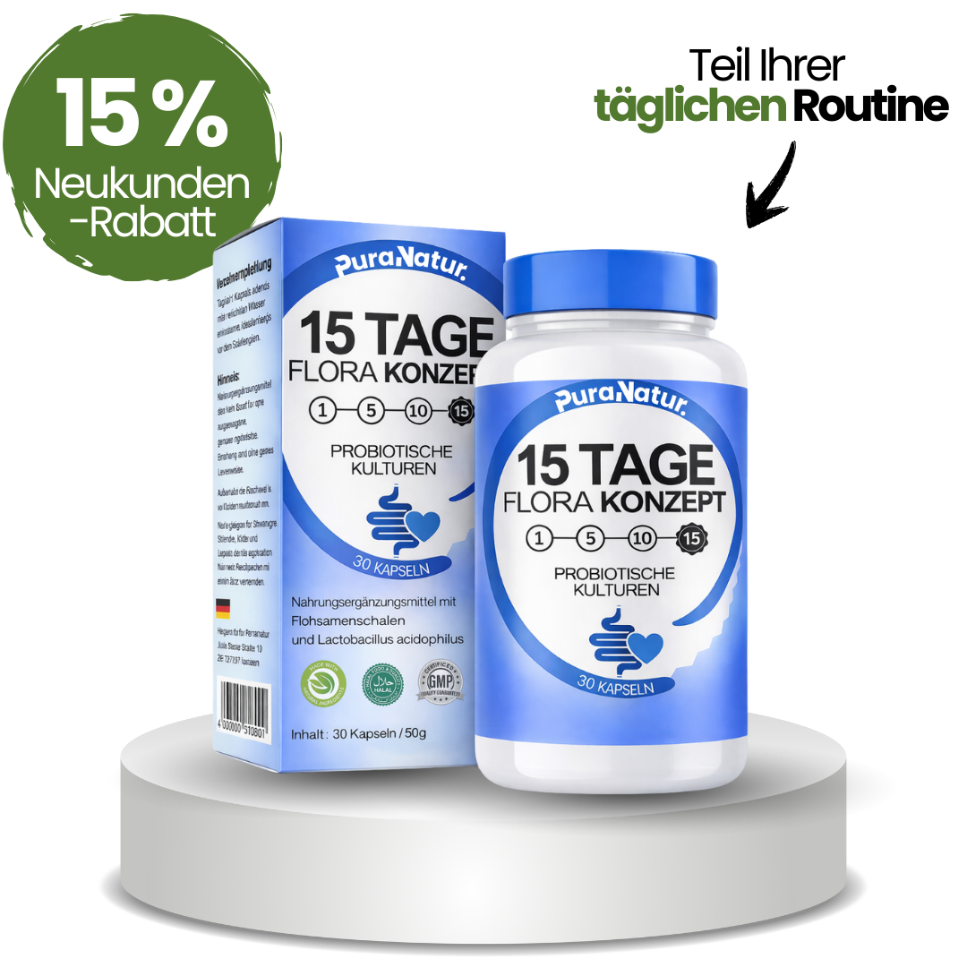 Unser 15-Tage-Flora-Konzept wurde als Ergänzung zur täglichen Ernährung konzipiert und kombiniert ausgewählte pflanzliche Inhaltsstoffe in Kapselform.